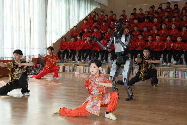 “特邀嘉宾”人形机器人与学生一起“习武”。天津市少年儿童活动中心供图