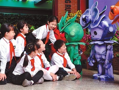 重庆树人景瑞小学校学生课间与智能机器人就校园生活对话。