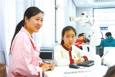 4月2日,江苏省无锡市中小学生在家长陪同下走进江南大学人工智能与计算机学院,体验AI科普课程,与机器人互动。高月鹏 摄