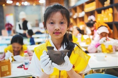 4月2日,在安徽省含山县凌家滩国家考古遗址公园,小学生们进行模拟文物修复。欧宗涛 琚娟娟 摄