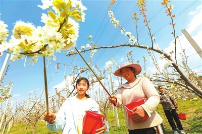 4月1日,在安徽省淮北市杜集区南山村禾林家庭农场,学生在梨园进行授粉劳动。李鑫 摄