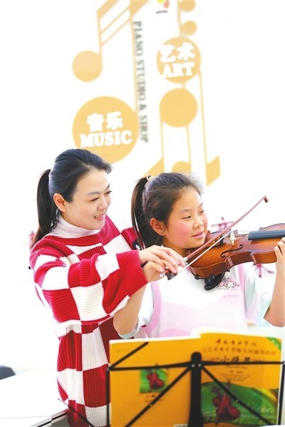 4月1日,在四川省乐山市犍为县一家艺术培训机构,志愿者老师指导小朋友学习小提琴。李华时 李梦涵 摄