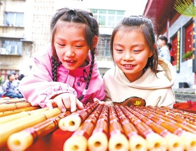 4月1日,在贵州省铜仁市玉屏侗族自治县箫笛博物馆,学生们挑选、体验竹笛。胡攀学 摄