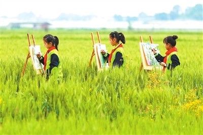 4月1日,四川省眉山市彭山区鹏利小学学生在观音街道兴崇社区千亩粮油基地参加春假研学——麦田写生活动。翁光建 摄