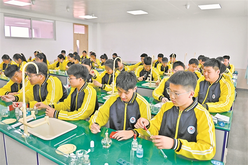 辽宁省海城开发区实验学校学生在化学实验室内做实验。 新华社记者 吴青昊摄