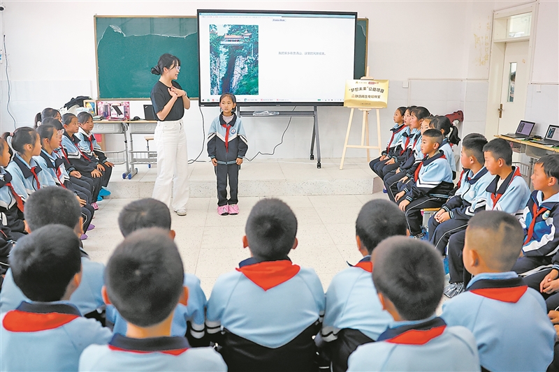甘肃省定西市漳县盐川学校的学生在AI课堂上与志愿者互动。 新华社记者 陈斌摄