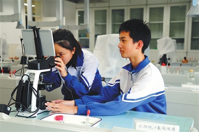 北京市第十二中学将传统显微镜与智能终端结合,开展科学实践课程。学校供图