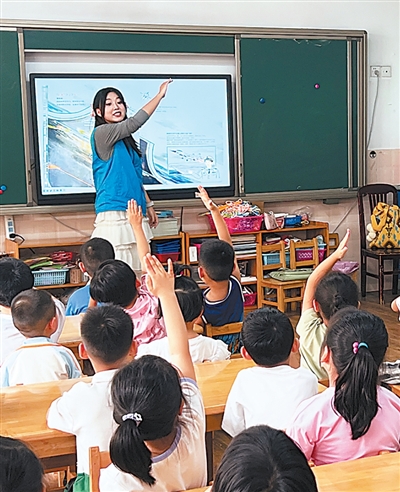 大别山腹地,安徽安庆市岳西县石关辅导小学的教室里,一名年轻女孩微笑着指向黑板。话音刚落,台下便“唰”地举起了一片小手。有的孩子急得身子前倾,坐在后排的一个小男孩干脆半站着,手臂伸得笔直,生怕被忽视。